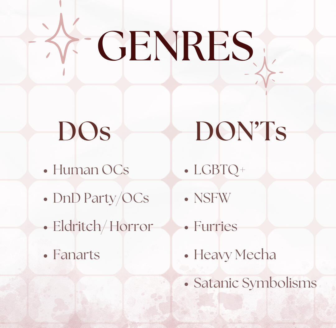 Nudity is only accepted for character sheets. Genitalia is strictly NOT included.